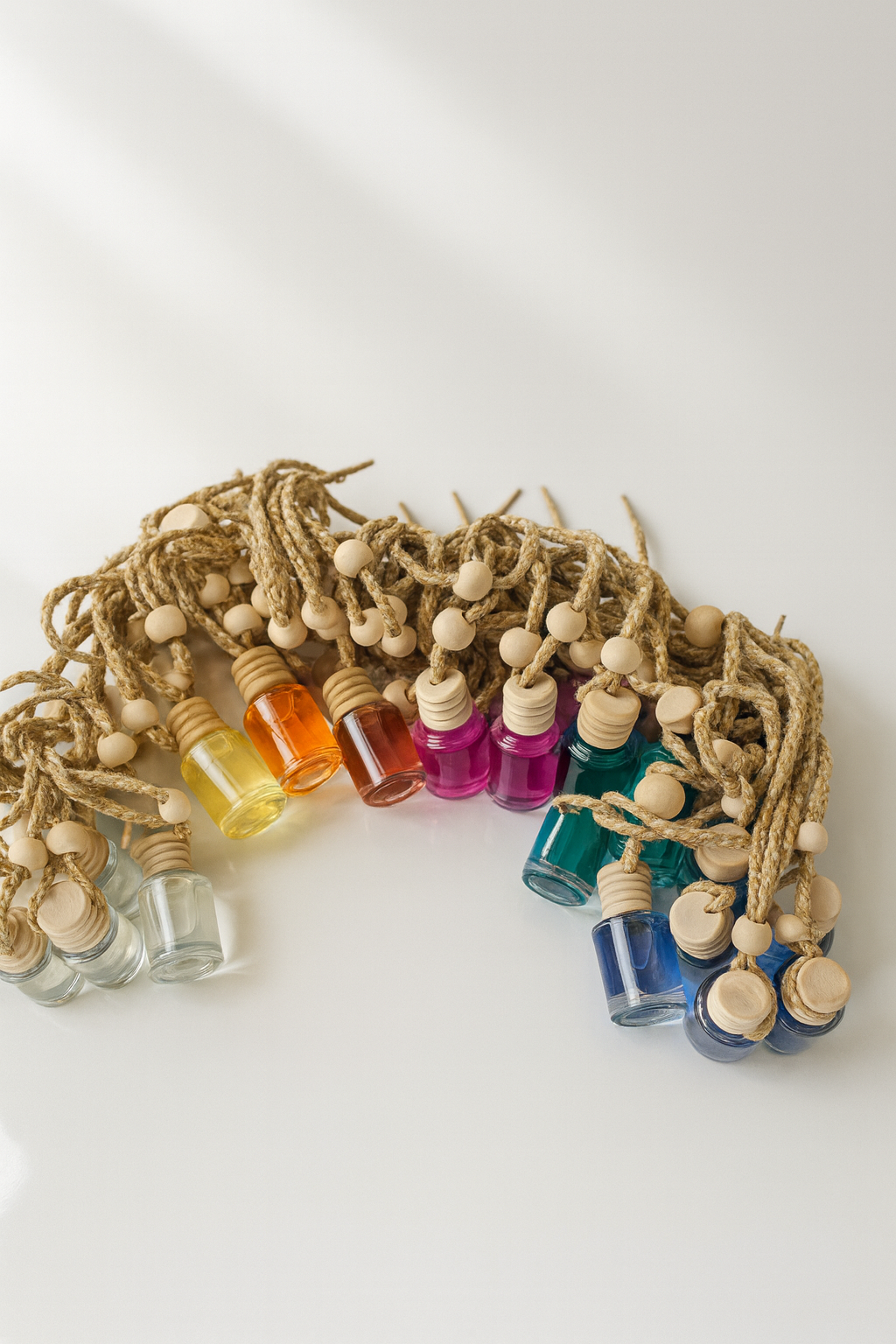 Cute diamond shaped car diffusers. Glass bottle with wood diffuser cap.