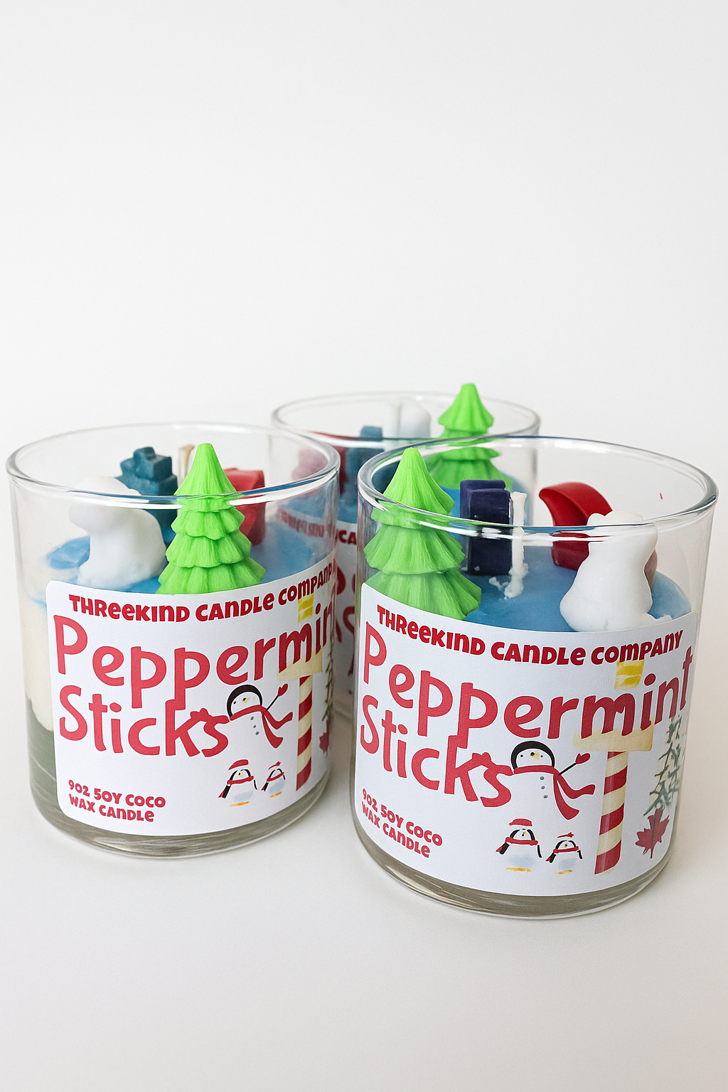 Hand-poured in Alberta with our custom soyâcoconut wax blend, Peppermint Sticks fills your space with a bright, uplifting winter aroma. Topped with playful wax embeds inspired by classic Christmas icons, itâs as cute as it is cozy.